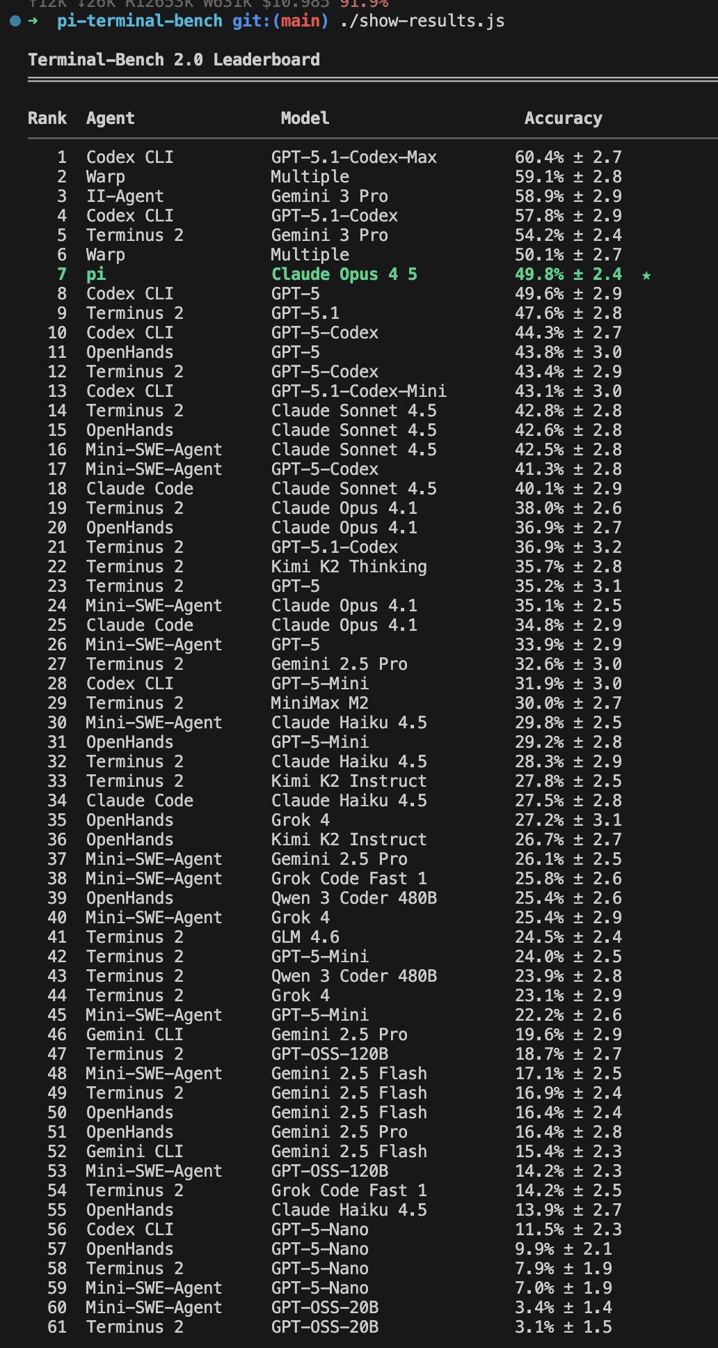 I make a lot of grandiose claims, but do I have numerical proof that all the contrarian things I say above actually work? I have my lived experience, but that's hard to transport in a blog post and you'd just have to believe me. So I created a Terminal-Bench 2.0 test run for pi with Claude Opus 4.5 and let it compete against Codex, Cursor, Windsurf, and other coding harnesses with their respective native models. Obviously, we all know benchmarks aren't representative of real-world performance, but it's the best I can provide you as a sort of proof that not everything I say is complete bullshit.