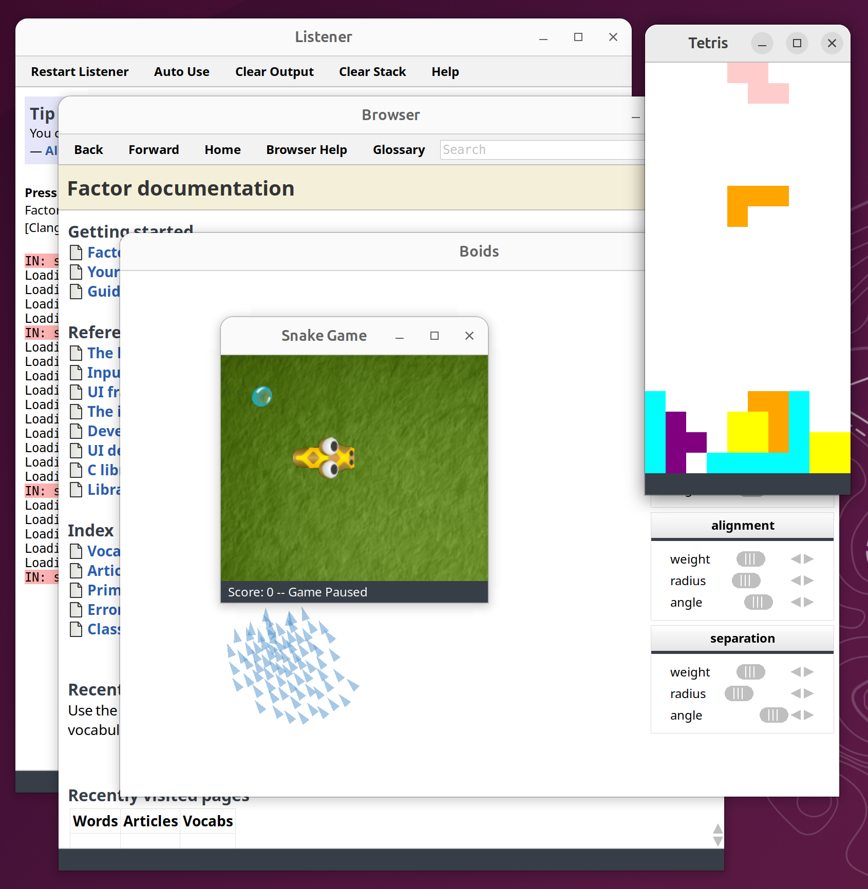 Factor has a native ui-backend that allows us to render our UI framework using OpenGL on top of platform-specific APIs for our primary targets of Linux, macOS, and Windows.