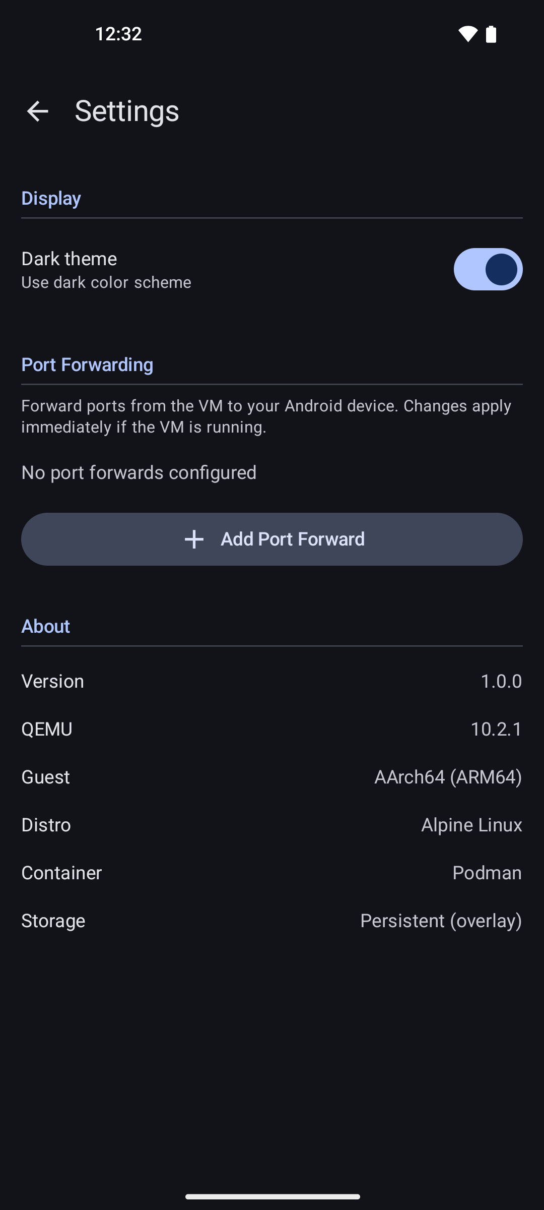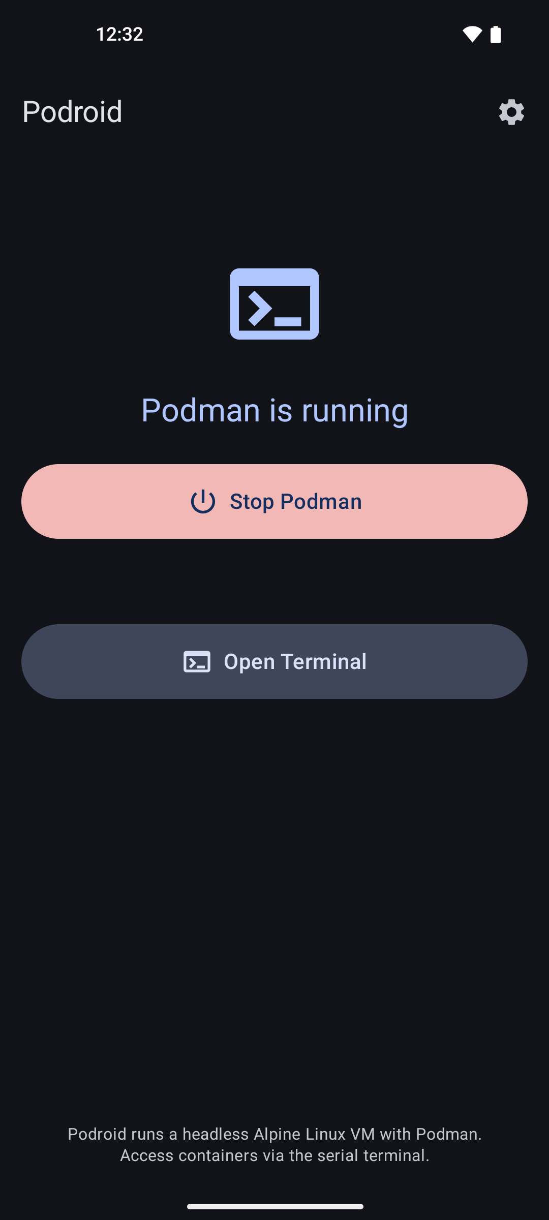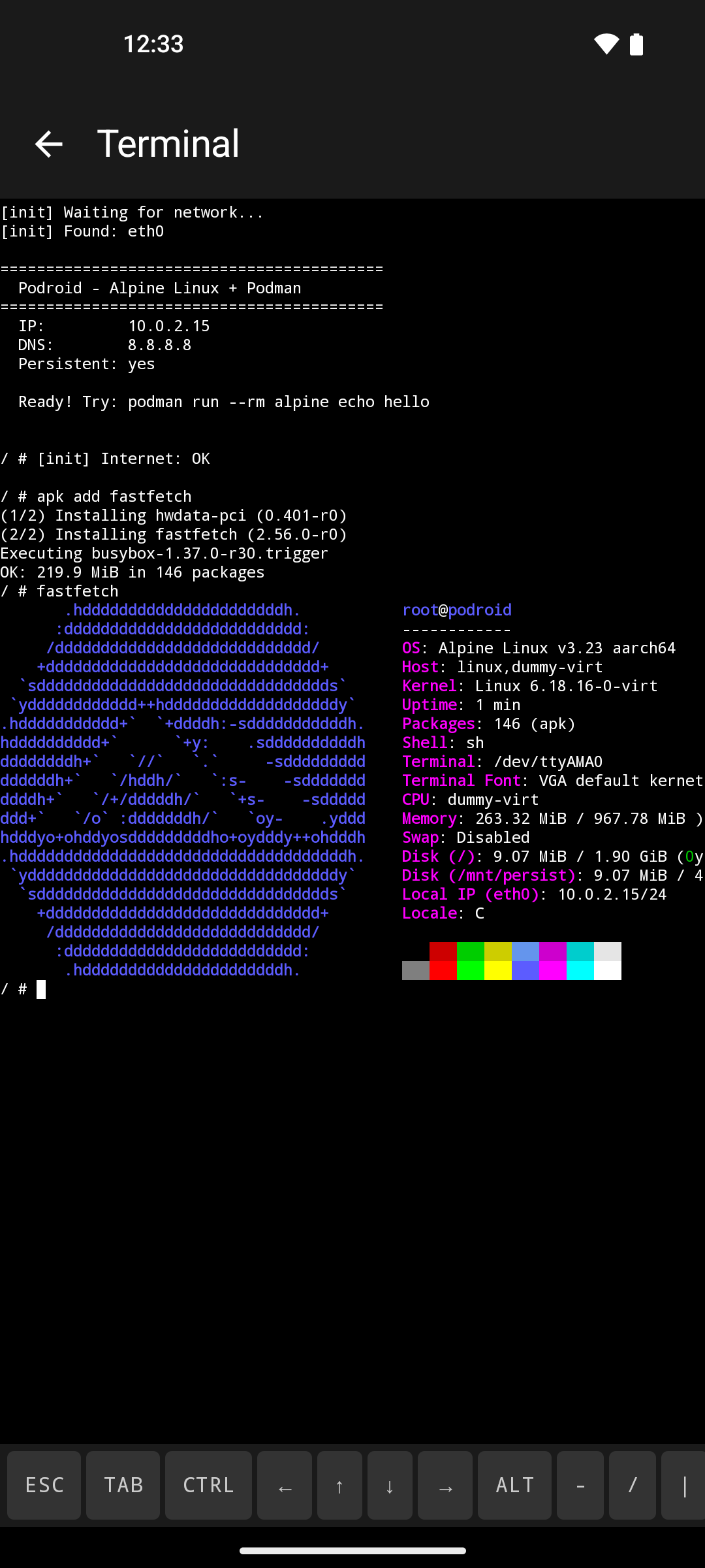 Podroid spins up a lightweight Alpine Linux VM on your phone using QEMU and gives you a fully working Podman container runtime with a built-in serial terminal.