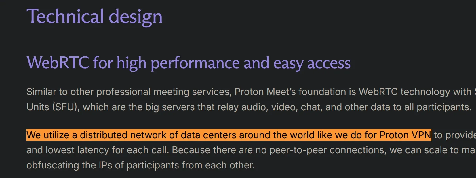 Proton's security model advertises that "participants can also join meetings anonymously without logging into a Proton account" and criticizes consumer apps like WhatsApp and FaceTime because "these services often default to peer-to-peer connections" where "participants can see each other's IP addresses."
