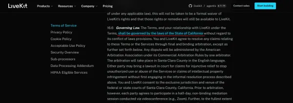 LiveKit Cloud is a California-incorporated commercial infrastructure vendor. Their terms of service specify that all disputes are governed by the laws of the State of California, with venue in the federal or state courts of Santa Clara County.