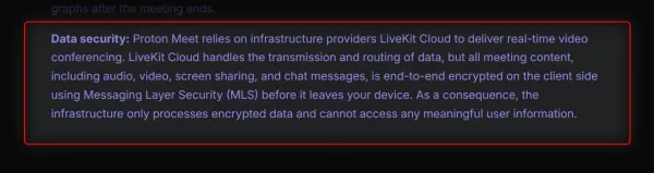 The disclosure is in Proton Meet's own privacy policy: "Proton Meet relies on infrastructure providers LiveKit Cloud to deliver real-time video conferencing. LiveKit Cloud handles the transmission and routing of data."